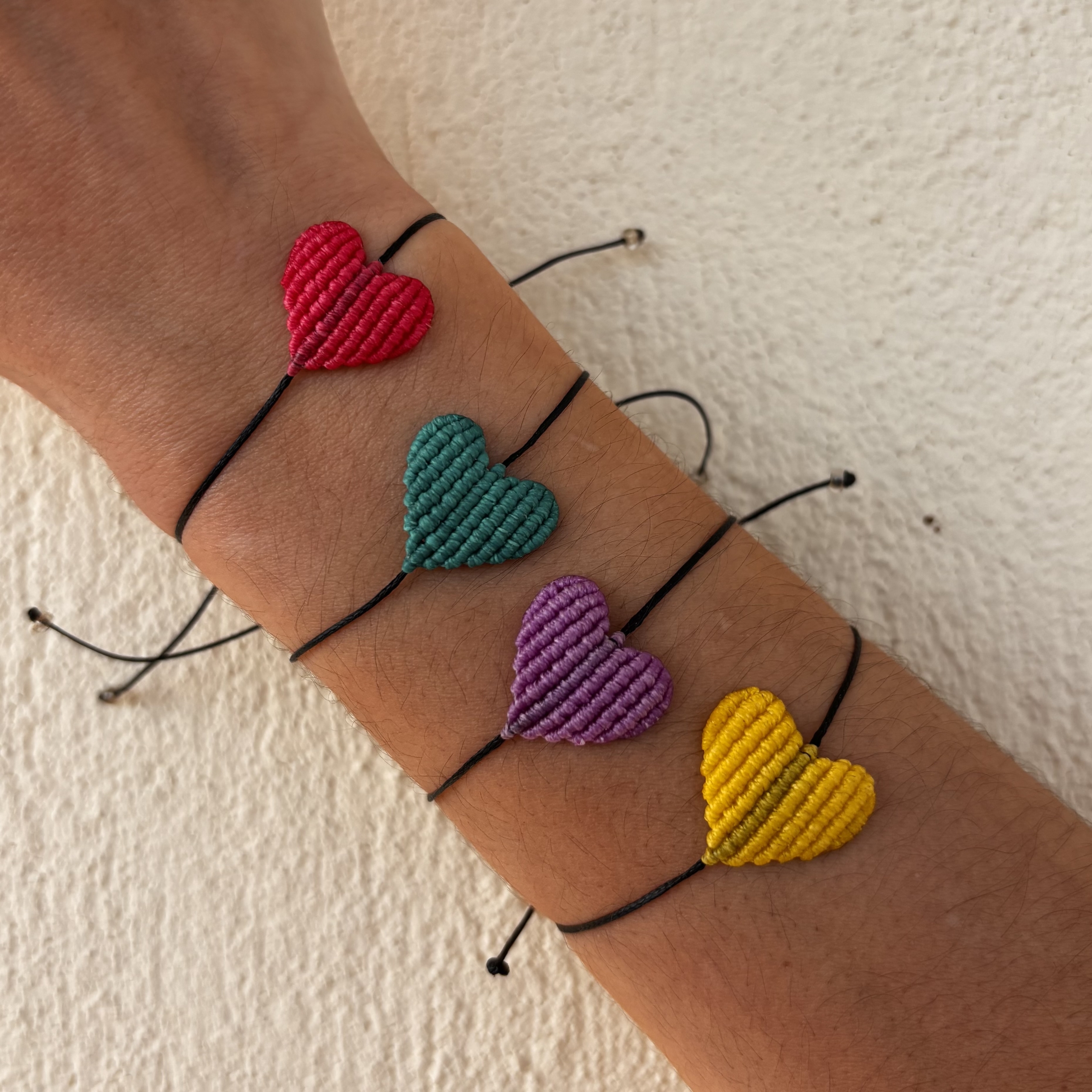 Υπέροχο μακραμέ βραχιόλι καρδιά σε έξι χρώματα για να διαλέξεις το αγαπημένο σου! Διαθέσιμο σε φούξια, βεραμάν, λιλά, κίτρινο, σομόν και γαλάζιο. Το λουράκι είναι σε μαύρο χρώμα και το μέγεθος είναι ενηλίκων.