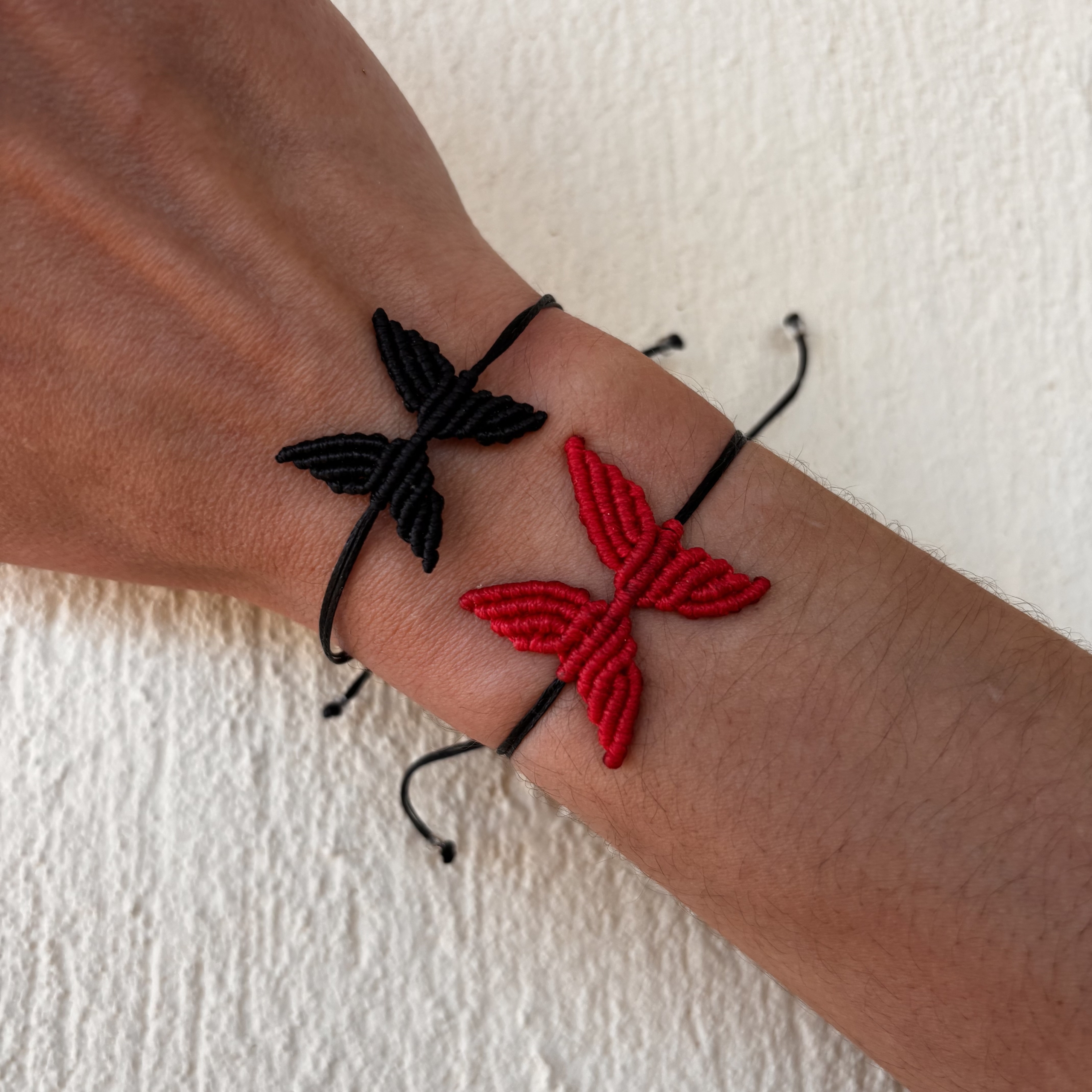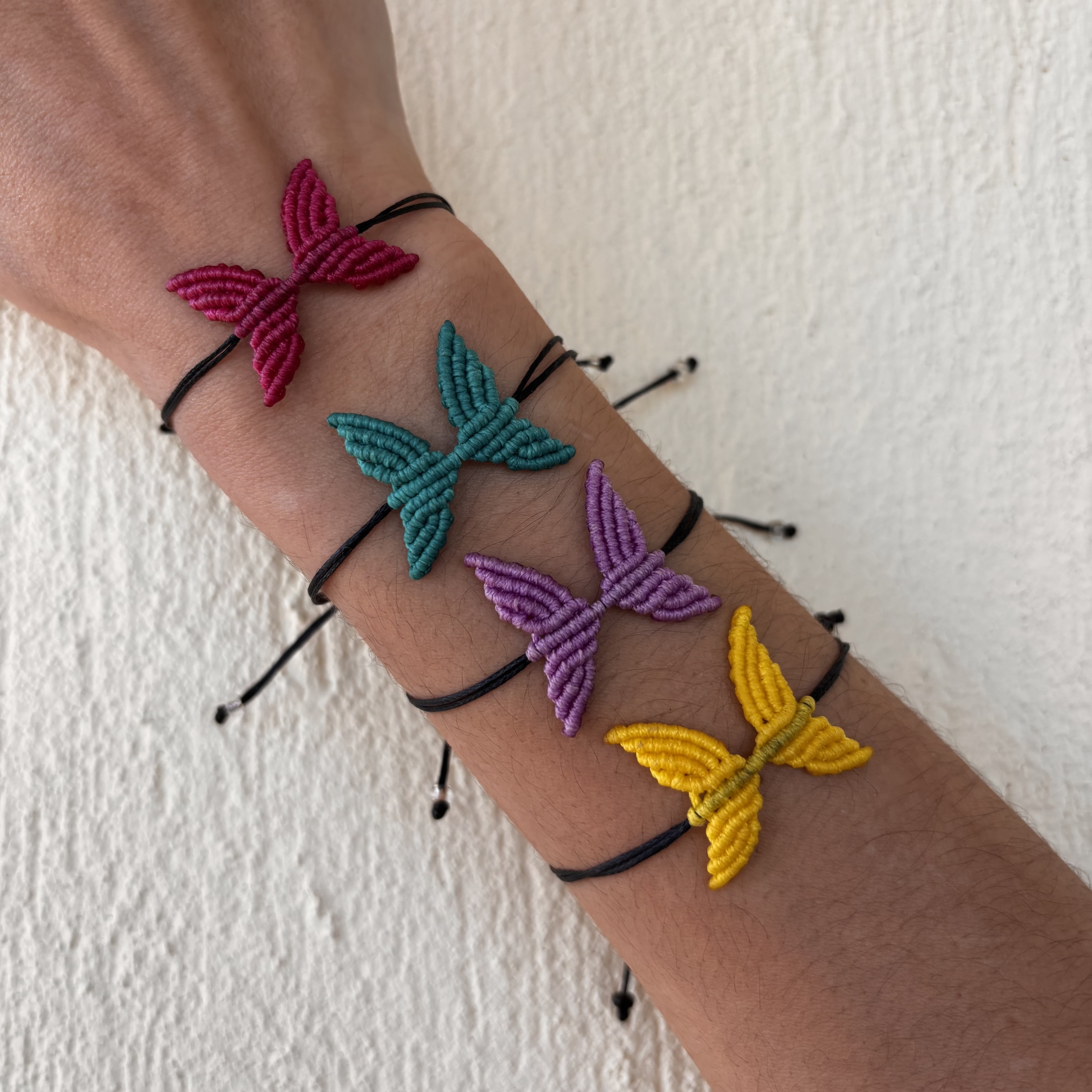 Υπέροχο μακραμέ βραχιόλι πεταλούδα σε δώδεκα χρώματα για να διαλέξεις το αγαπημένο σου! Διαθέσιμο σε φούξια, βεραμάν, λιλά, μωβ, κίτρινο, σομόν, γαλάζιο, σιέλ, μπλε, μαύρο, κόκκινο και μπεζ. Το λουράκι είναι σε μαύρο χρώμα και το μέγεθος είναι ενηλίκων.
