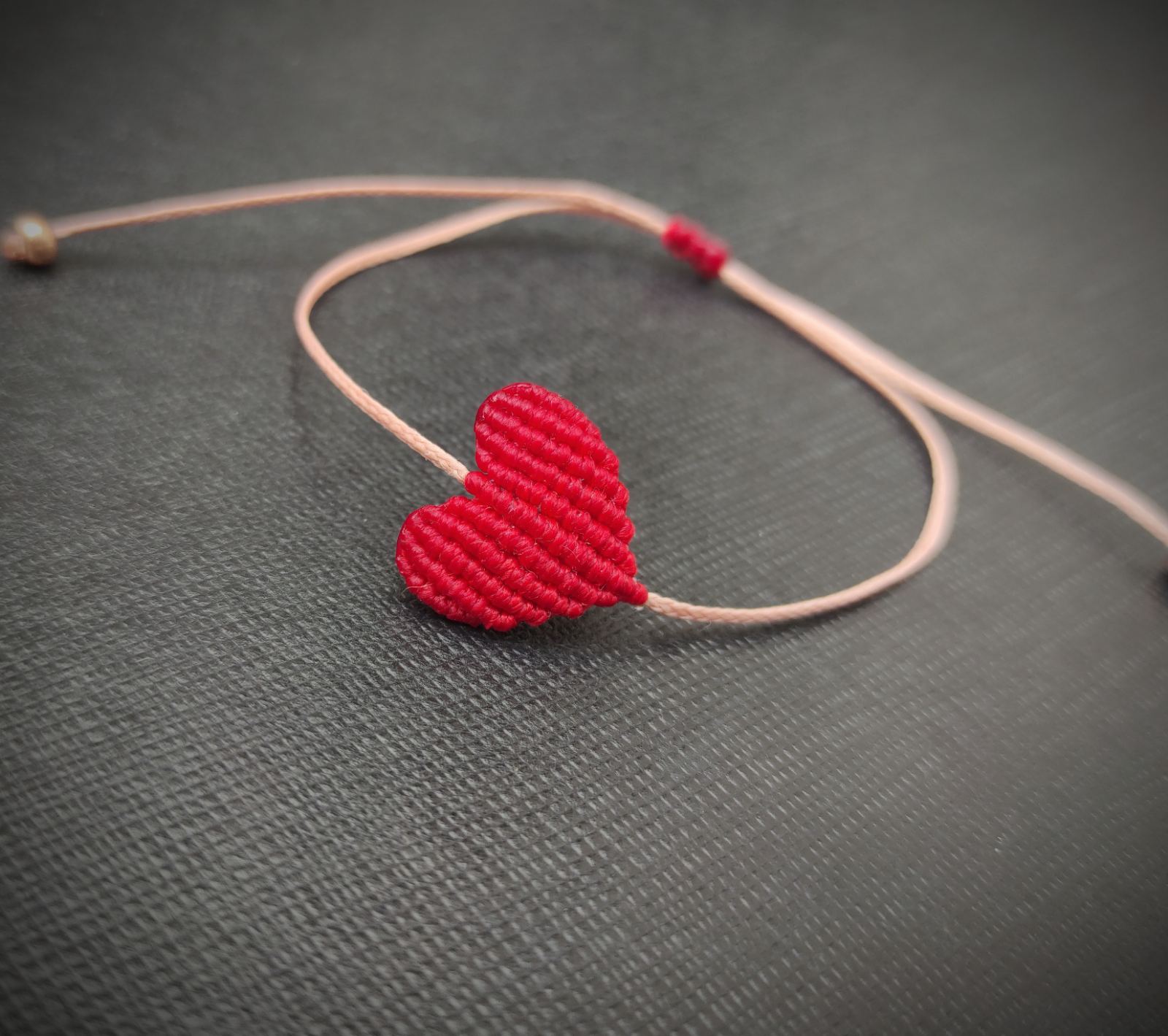 Προσθήκη Στα ΑγαπημέναΠανέμορφο βραχιόλι με μακραμέ καρδιά σε κόκκινο χρώμα, πλεγμένο με κηροκλωστή. Το λουράκι είναι ροζ-χρυσό με δέσιμο σε κόκκινο χρώμα και αυξανόμενο άνοιγμα. Φοριέται καθημερινά και συνδυάζεται με όλα! Θα το λατρέψετε!